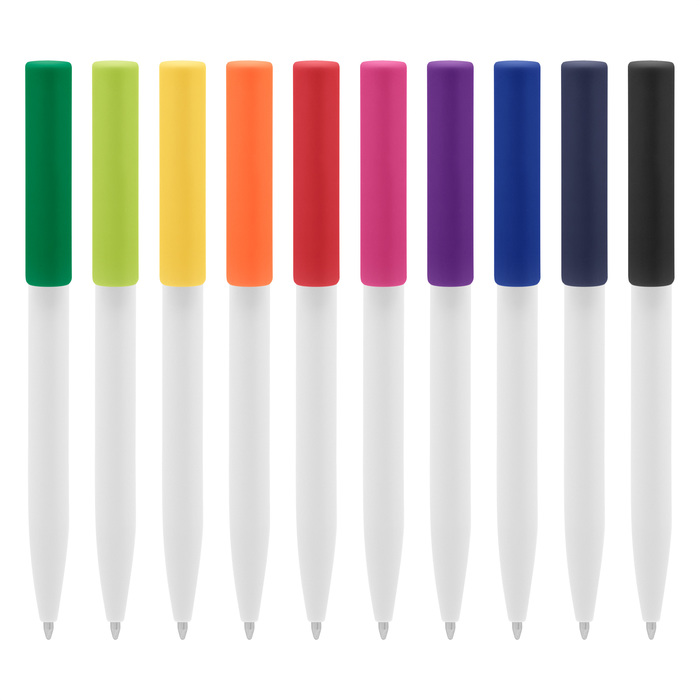 Plástico. Cuerpo blanco y clip de diferentes colores. Bolígrafo retráctil. Clip plástico de colores. Tinta negra. Sistema de botón push para destapar. Amplia área de impresión.