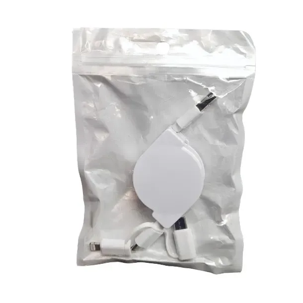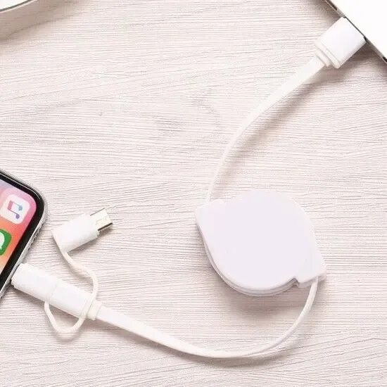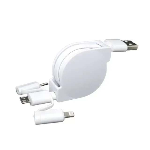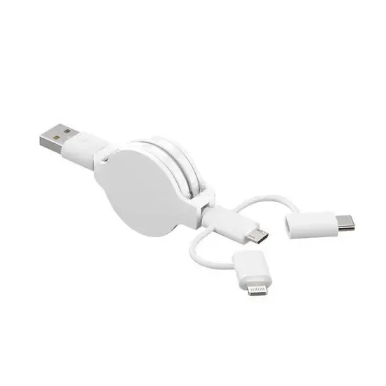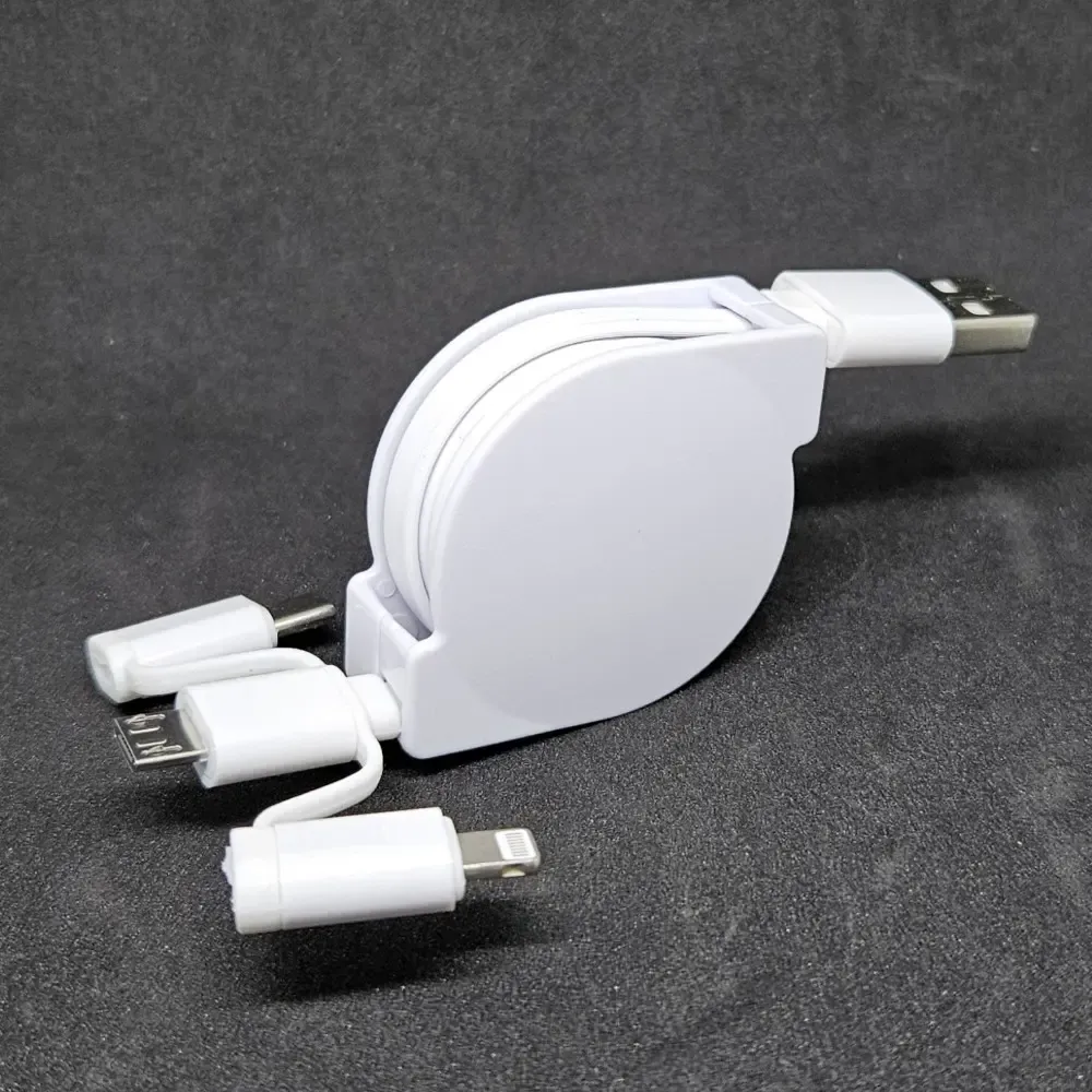 Cable retráctil 3 en 1 con carga rápida y diseño reforzado. Compatible con iPhone, Micro USB y USB-C. Compacto, portátil y personalizable con logo. Ideal para uso diario y disponible en blanco y negro.