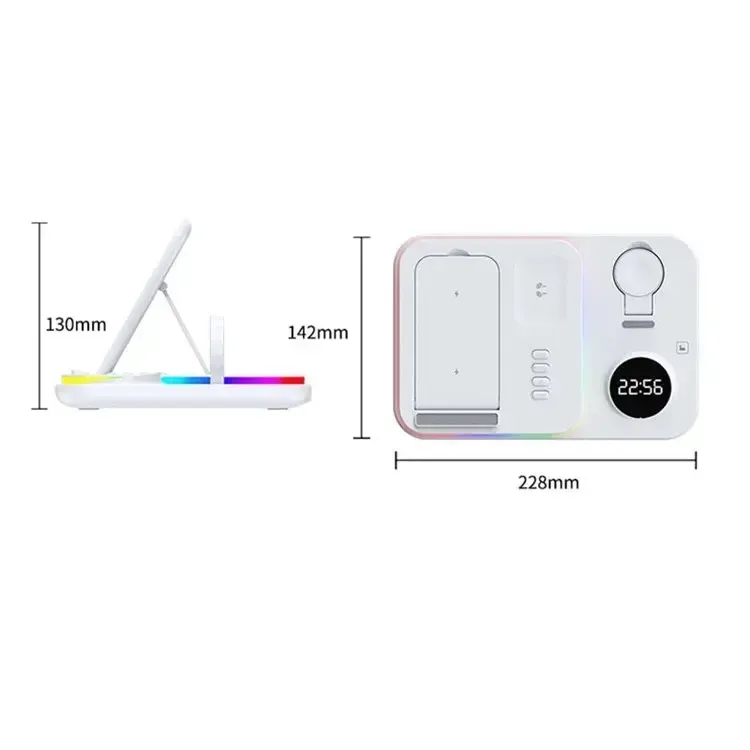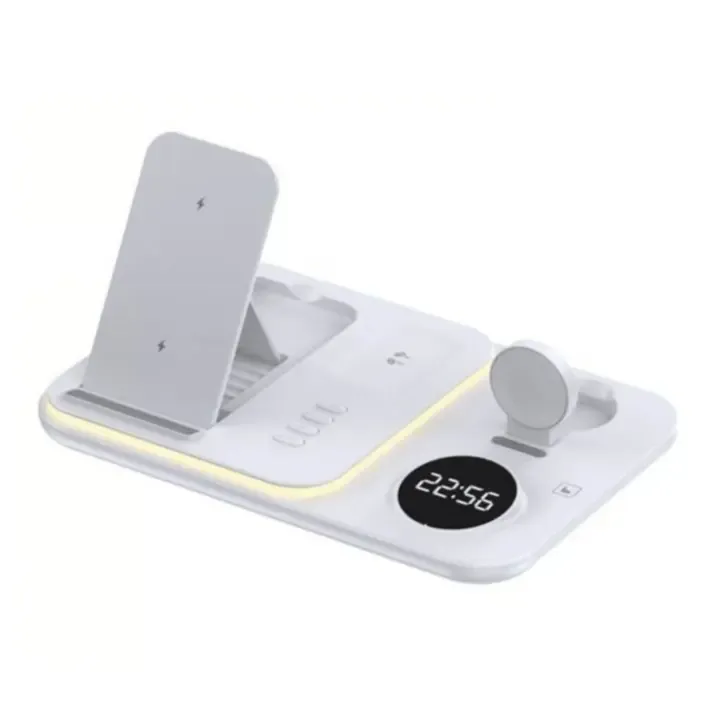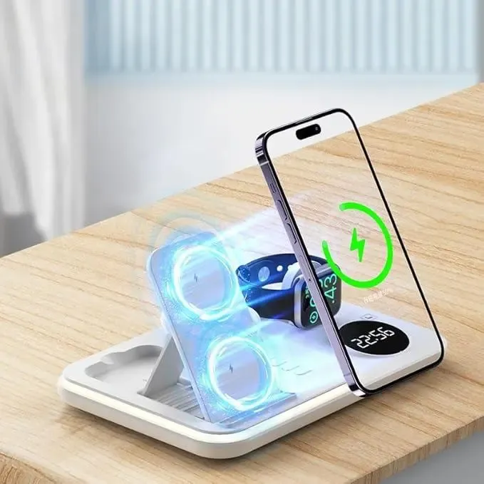 Cargador inalámbrico 5 en 1 con diseño moderno y compacto. Carga simultáneamente tu celular, auriculares y smartwatch, incluye reloj digital, luz RGB ajustable y puerto USB extra. Ideal para mantener tu espacio ordenado y tus dispositivos siempre listos, en casa, la oficina o mientras viajás.