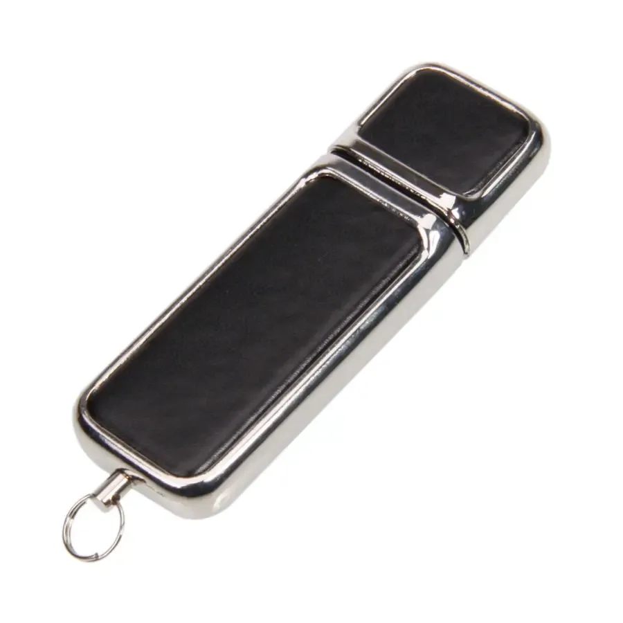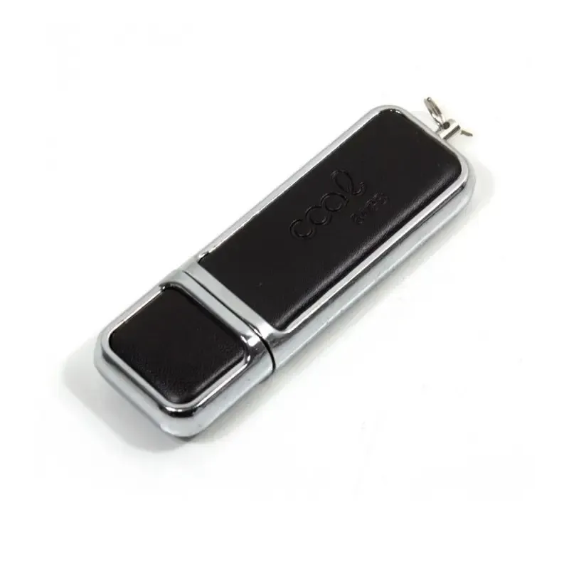 Pen Drive de cuero negro con 8GB de capacidad y conexión USB 2.0. Elegante y funcional, fabricado con memoria Grado A para un rendimiento confiable. Incluye anillo para colgar, ideal para llevar tus archivos con estilo y seguridad.
